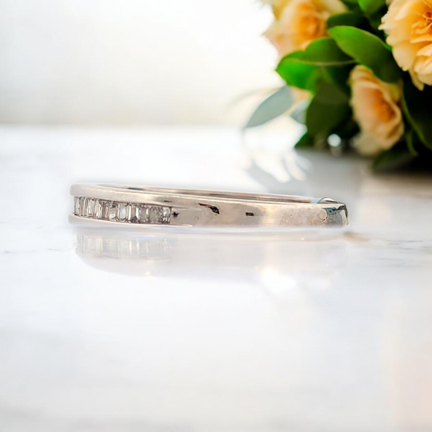 Denise | 14k White Gold Band | .52 ctw Baguette Diamonds | Size 7 | The Denise Band is a symbol of elegance and refined luxury, crafted from 14k white gold and adorned with .52 carat total weight (ctw) of baguette-cut diamonds . The diamonds are set halfway around the band, offering a striking yet subtle sparkle. This exquisite ring, in a comfortable size 7, is perfect for adding a timeless touch to your jewelry collection, whether as a wedding band, anniversary piece, or a sophisticated stacking ring.