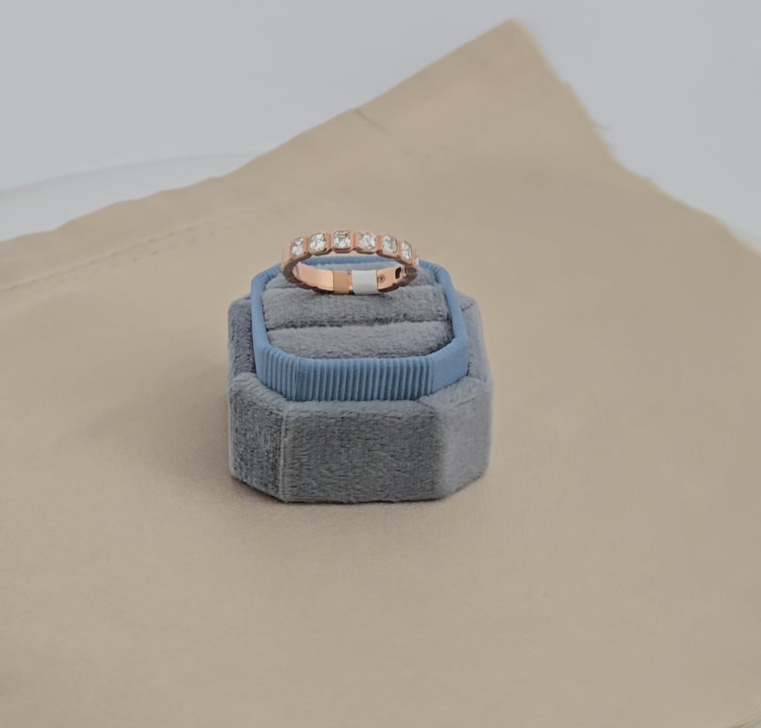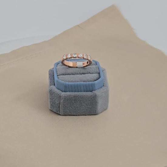 Hallah | 14k Rose Gold | Lab Diamond | Ring | Elevate your bridal collection with this stunning 14k rose gold wedding band, designed to complement any engagement ring with timeless elegance. Featuring nine brilliant 0.81-carat Asscher-cut diamonds, this size 7 ring delivers exceptional sparkle and sophistication. The warm blush tone of rose gold creates a romantic, modern aesthetic that flatters all skin tones. Perfect for brides seeking a distinctive band that balances luxury with wearable comfort, this piece combines expert craftsmanship with premium materials for a wedding day treasure you'll cherish forever.