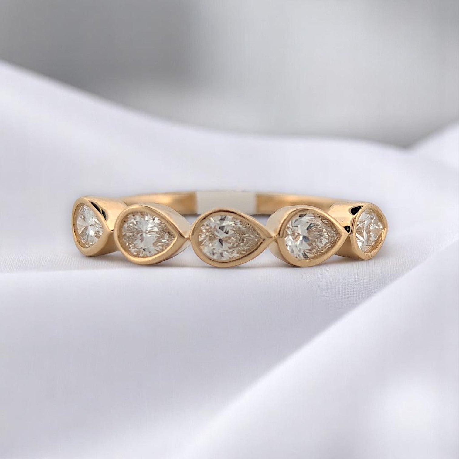 Josephine | 14K Yellow Gold | Lab Diamond | Josephine is a refined 14K yellow gold band featuring .75 CTW of pear-shaped lab-grown diamonds, each securely nestled in a smooth bezel setting. With its modern silhouette and elegant sparkle, this ring is perfect for stacking or wearing solo as a contemporary statement of style and sustainability.