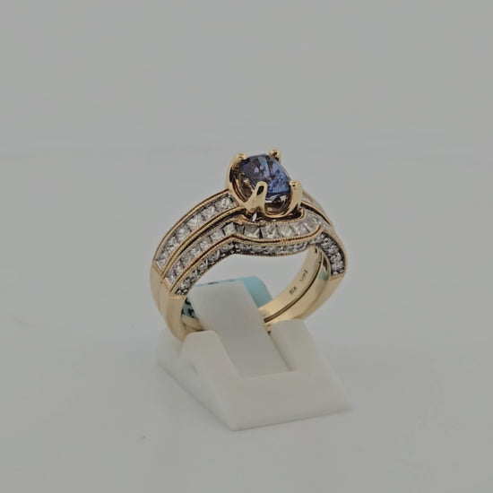 Marisol | 14K Yellow Gold Wedding Set | 1.25 CT Tanzanite Center | 1.52 CTW Natural Diamond Accents | Round & Princess Cut | Size 7 | This exquisite 14K yellow gold wedding set features a mesmerizing 1.25 CT tanzanite center stone, elegantly surrounded by 1.52 CTW natural diamonds in a mix of round and princess cuts. The rich blue-purple tanzanite is beautifully complemented by the warm yellow gold setting, creating a timeless and sophisticated bridal look.