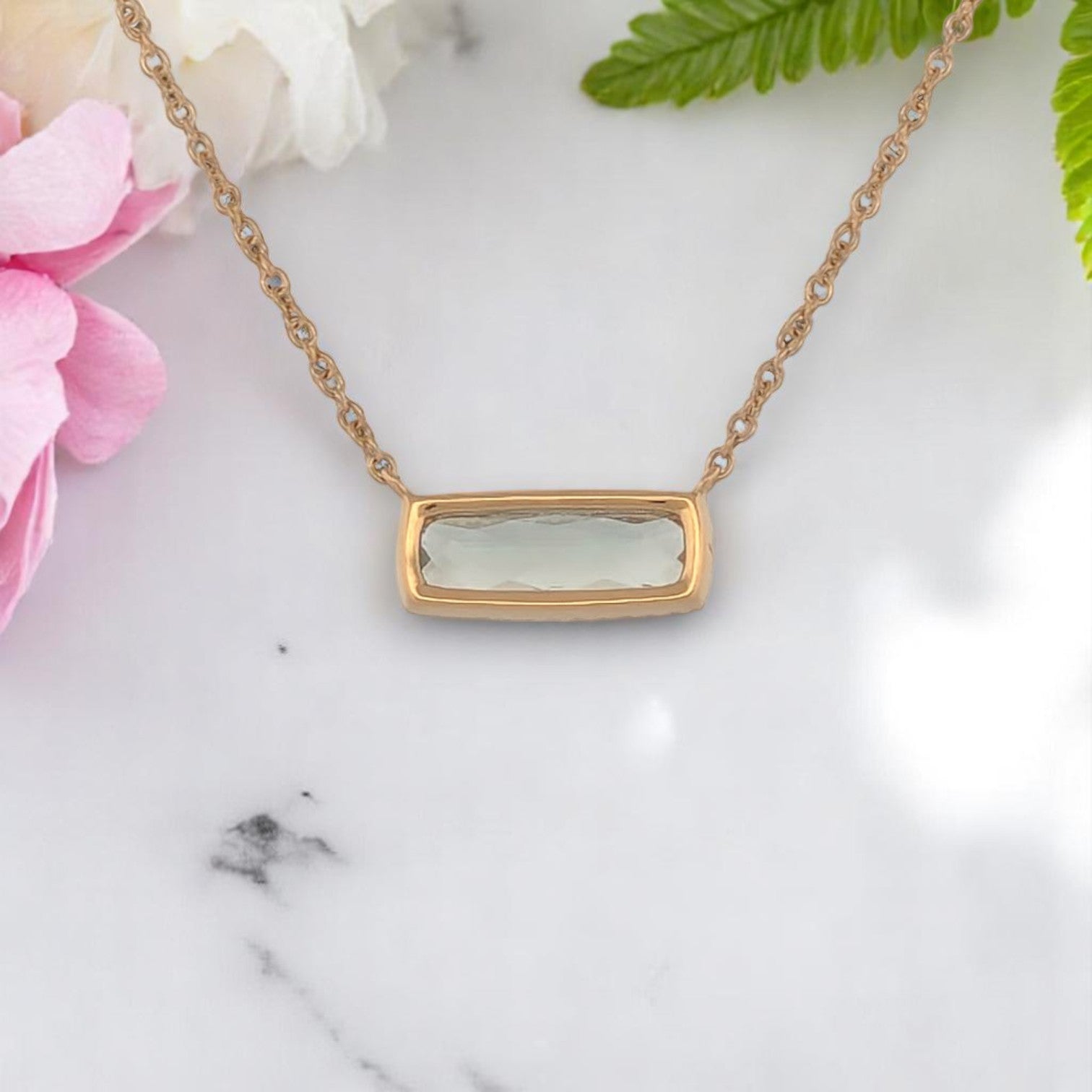 Arianwen Mint Green Amethyst Necklace | 18K Yellow Gold | 1.16ct Amethyst | 0.13ctw Natural Diamonds | 16"-18" Adjustable Rolo Chain | Crafted in rich 18K yellow gold , this elegant piece features a glowing 1.16ct mint green amethyst , known for its subtle, serene hue. A halo of 0.13ctw natural round diamonds adds brilliance and contrast, enhancing the pendant’s ethereal beauty. The design is completed with a fixed 16"-18" adjustable rolo chain , offering versatility and timeless style. Perfect for those who cherish understated elegance, the Arianwen Necklace brings a gentle radiance to any occasion.