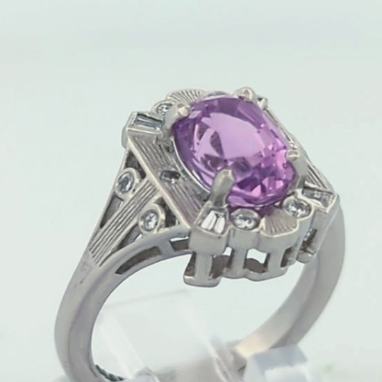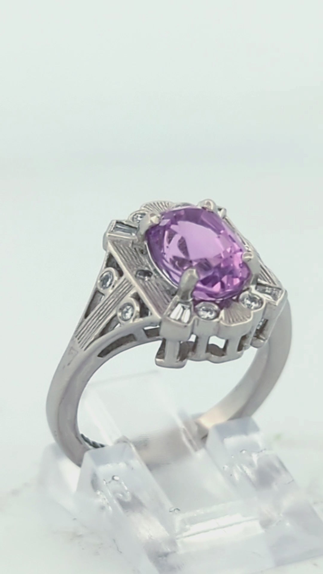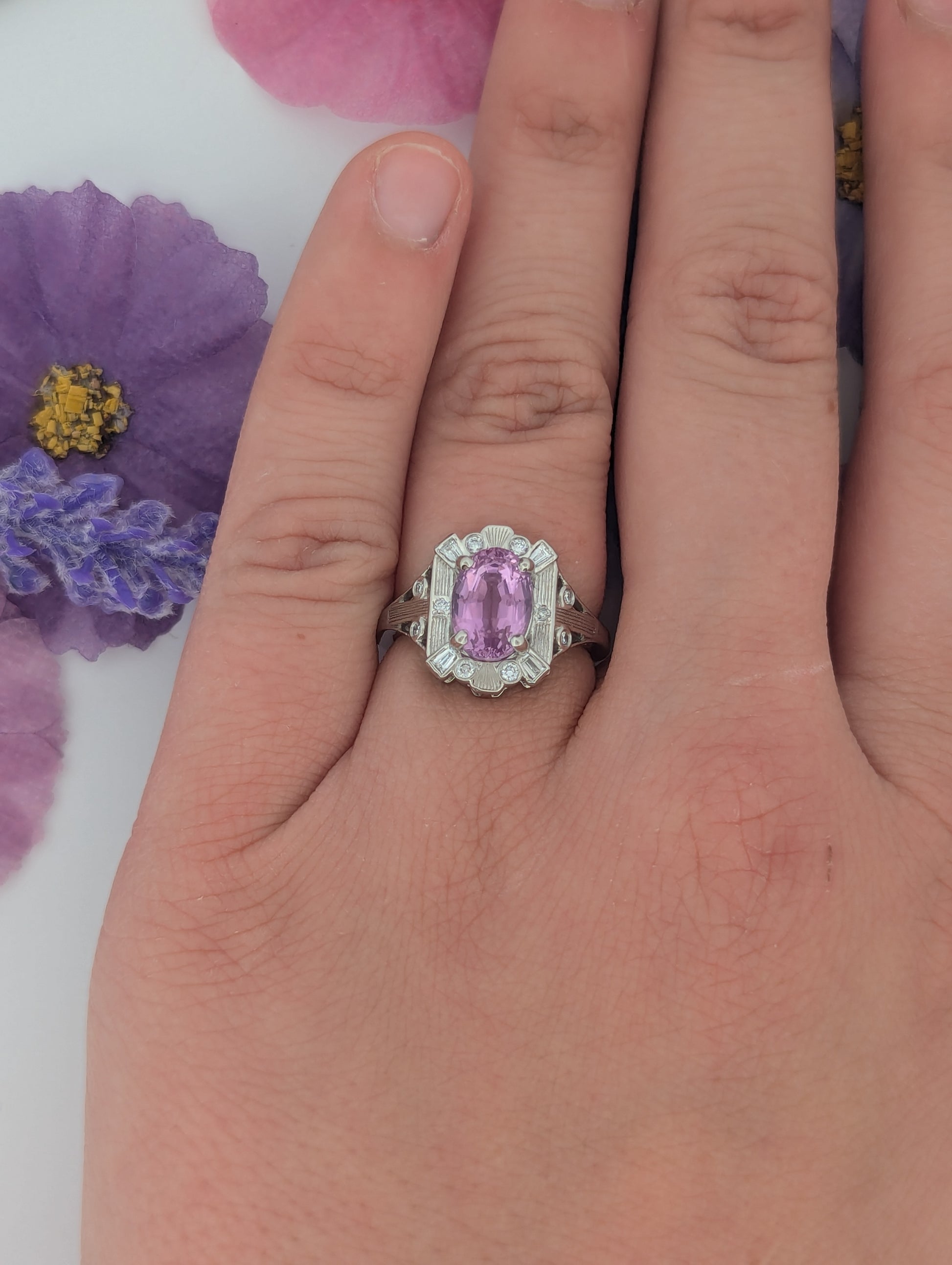Rhiannon Platinum Ring | 2.58ct Kunzite | Crafted in lustrous platinum, this size 7 ring centers a 2.58-carat natural oval Kunzite , prized for its soft pink hue and mesmerizing clarity. Framing the Kunzite are 0.35 carats total weight (ctw) lab-created diamond, hand-set to amplify brilliance while complementing the gemstone’s delicate glow.