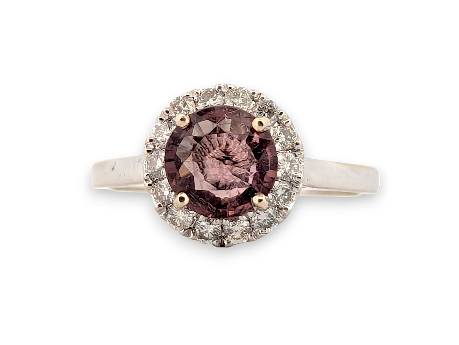 Sienna | 14K White Gold Ring With 1 CT Tourmaline | .33 CTW Natural Diamond Halo | This stunning 14K white gold ring features a vibrant 1 CT tourmaline center stone , beautifully surrounded by a .33 CTW natural diamond halo . The elegant design and exquisite craftsmanship make this ring a standout piece, perfect for any special occasion.