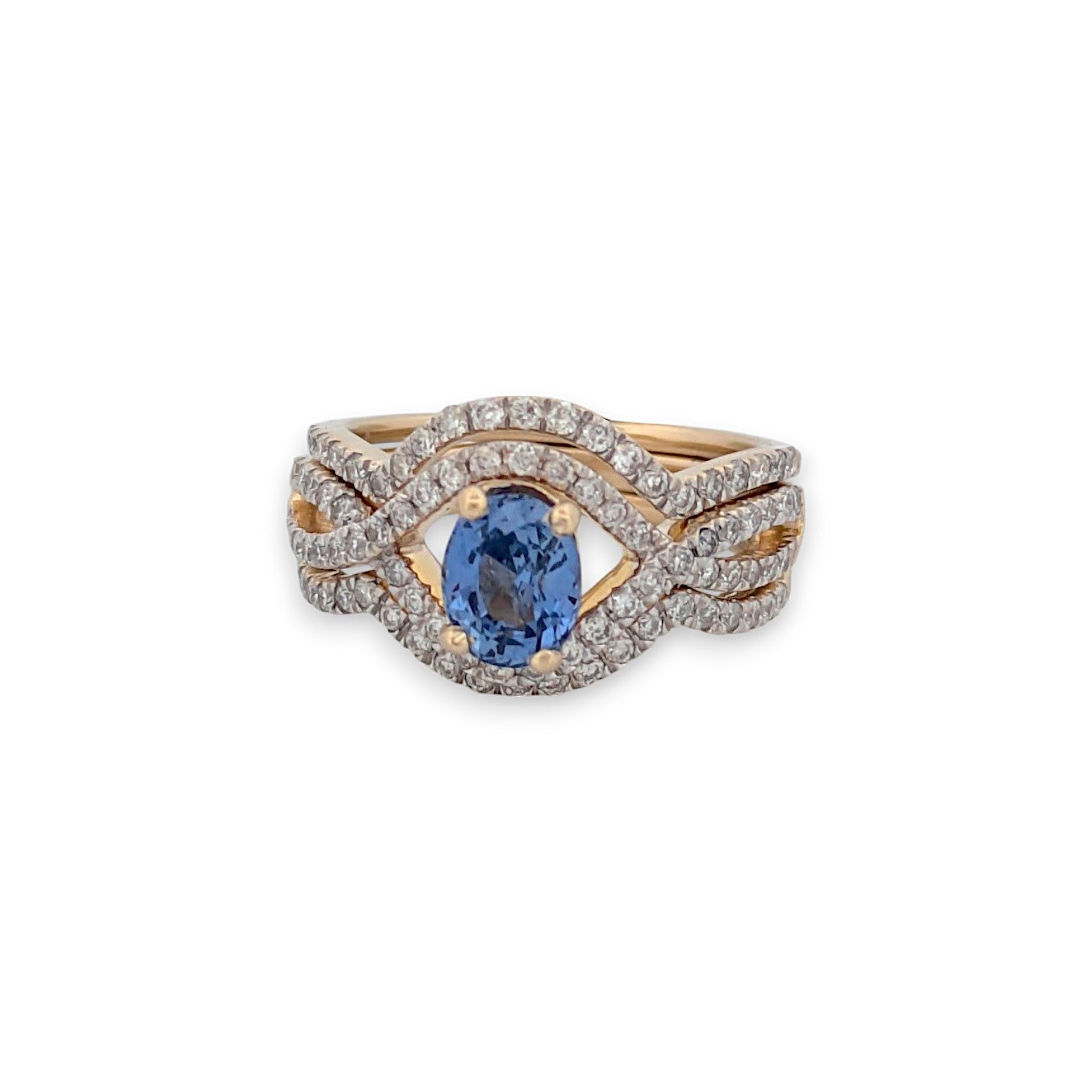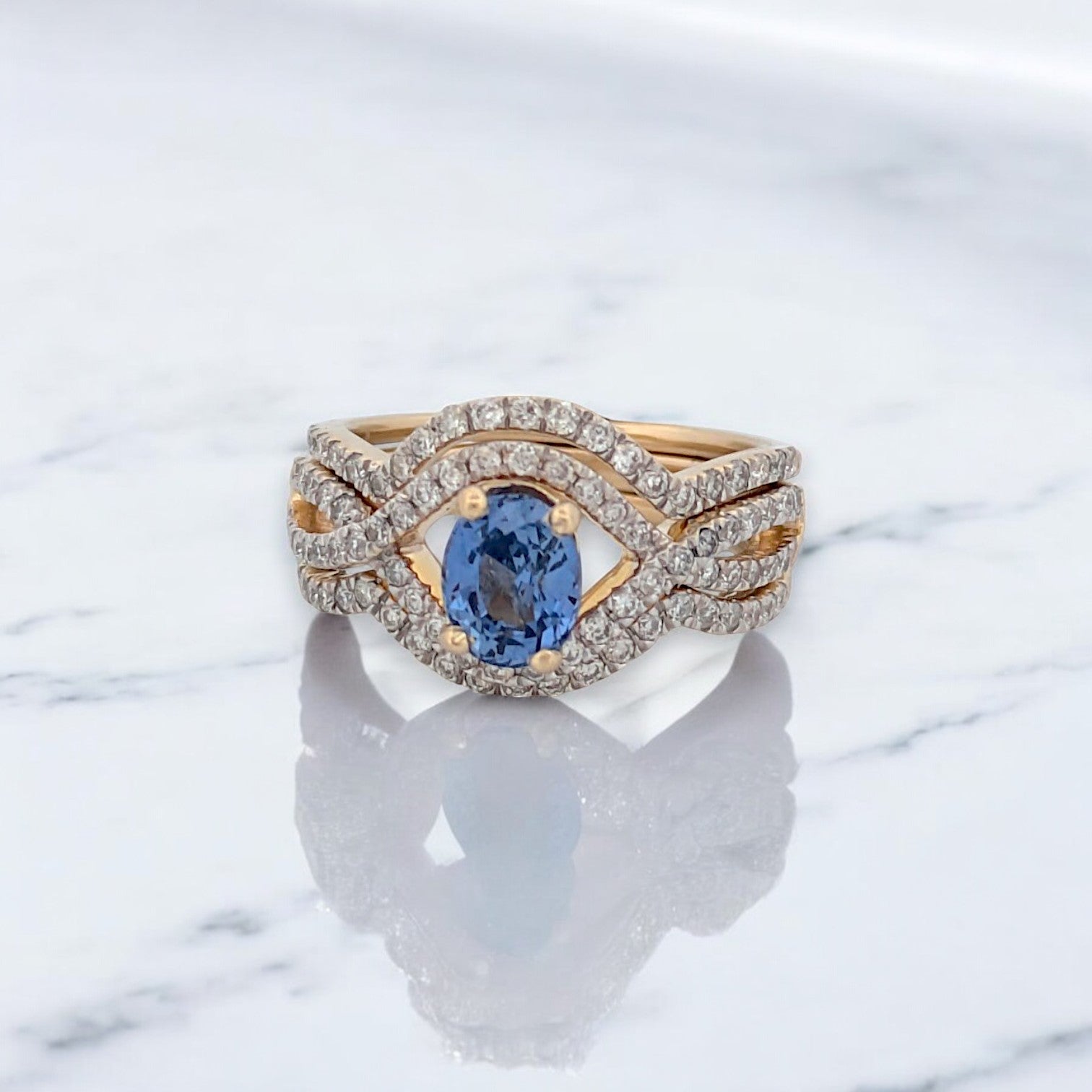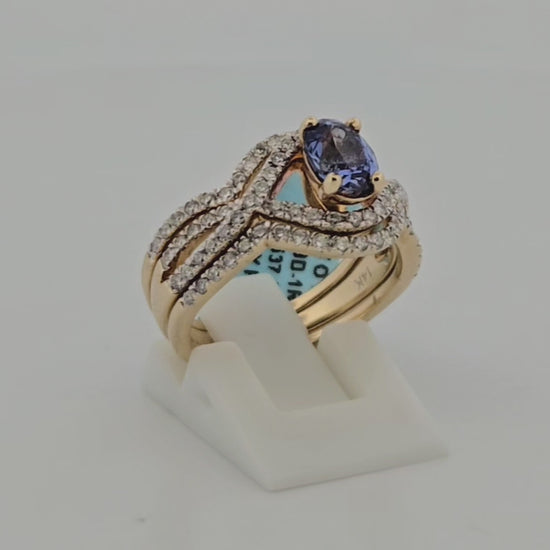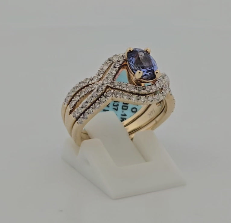 Isla | 14K Yellow Gold Tanzanite & Diamond Wedding Set | .70 CT Oval Tanzanite |+ .70 CTW Natural Diamonds | Matching Contour Bands | Size 6 | This breathtaking 14K yellow gold wedding set features a striking .70 CT oval-cut Tanzanite , beautifully complemented by .70 CTW natural round diamonds . Designed with matching contour bands , this set offers a seamless, elegant fit, making it a perfect choice for brides seeking timeless sophistication.