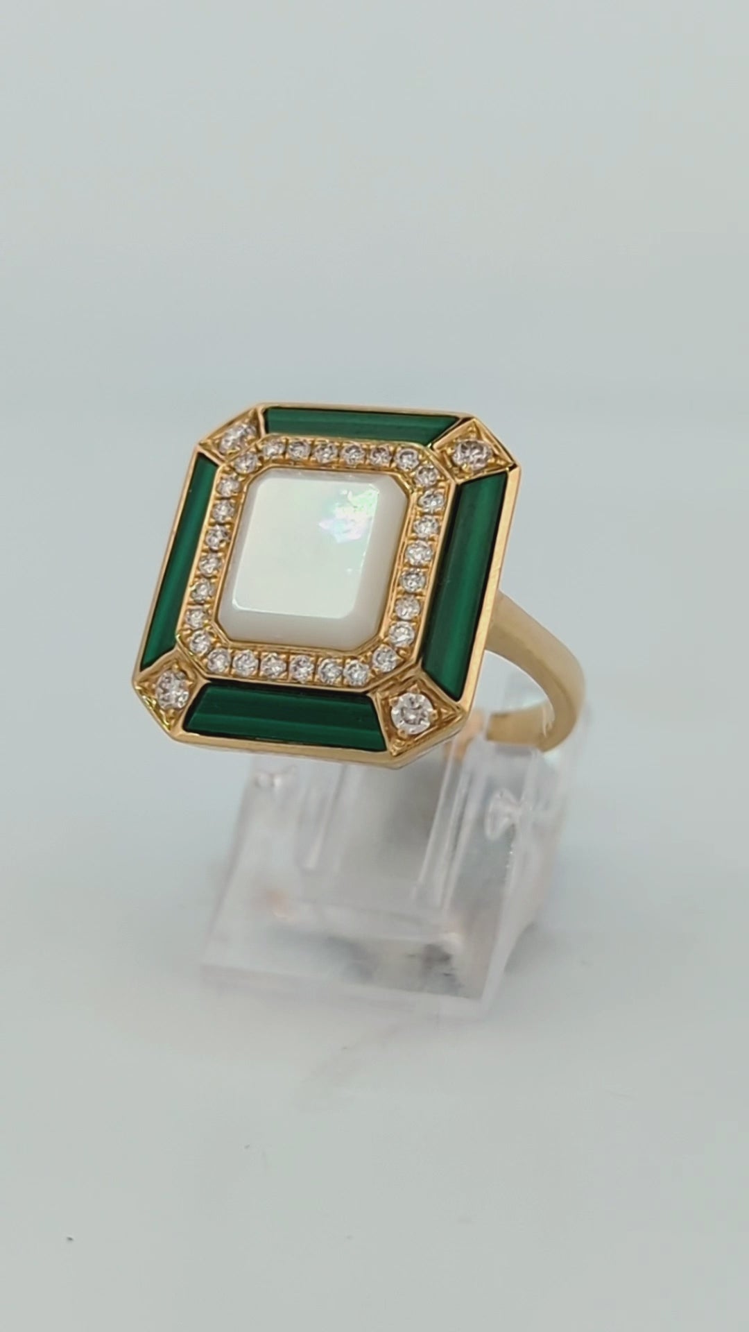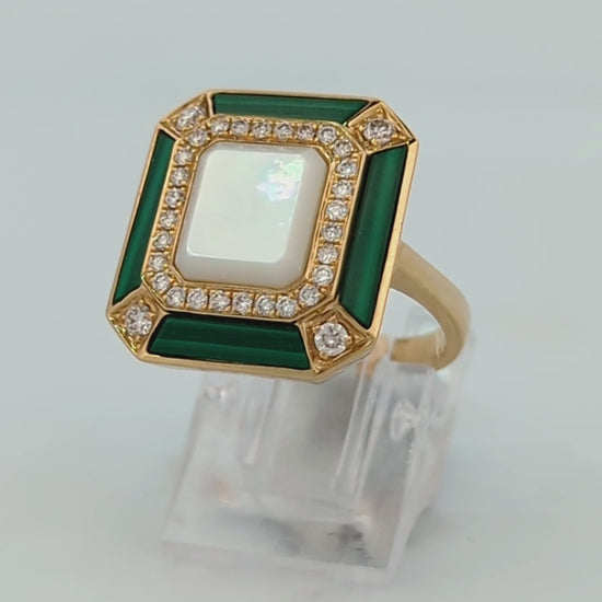 Zephyrine – 18K Yellow Gold| 2.02 CT Mother of Pearl | 1.19 CT Malachite, | 0.36 CTW Natural Round Diamonds | Crafted in solid 18K yellow gold, this Verde ring unites the soft iridescence of mother of pearl with the rich green depths of malachite, accented by the timeless sparkle of fine diamonds. A 2.02 carat natural mother of pearl forms the luminous centerpiece, glowing with soft, opalescent tones. Complementing it is a 1.19 carat natural malachite, its deep green bands adding a touch of organic drama. Surrounding these gemstones are 0.36 carats of natural round diamonds, hand-selected for brilliance, that create a halo of light around the bold color pairing.